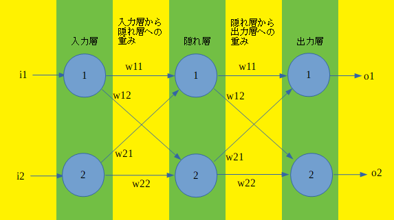 i1は入力1、i2は入力2 入力層から隠れ層への重みは w11が入力層①から隠れ層①への重み w12が入力層①から隠れ層②への重み w21が入力層②から隠れ層①への重み w22が入力層②から隠れ層②への重み 隠れ層から出力層への重みは・・・(以下略) |