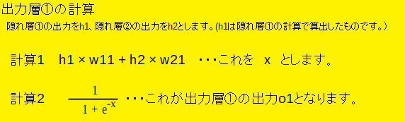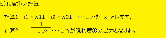隠れ層①の場合は、 入力層①の信号i1と入力層①から隠れ層①の重みw11をかけたものと 入力層②の信号i2と入力層②から隠れ層①の重みw21をかけたものを足し算します。 その足し算したものにシグモイド関数を適用(計算2の部分)すると、 それが隠れ層①の出力となります。 隠れ層②の計算も同様です。 |