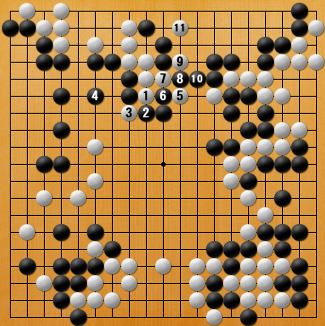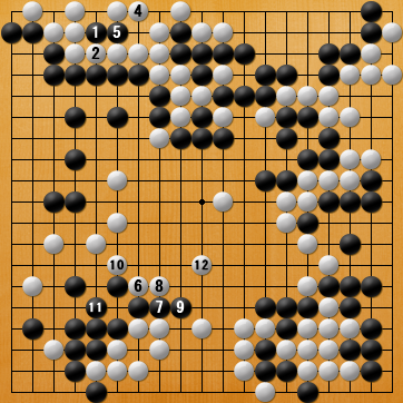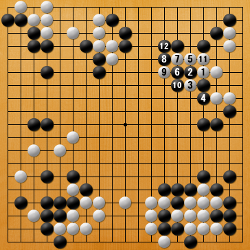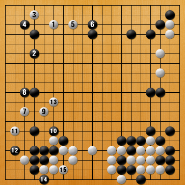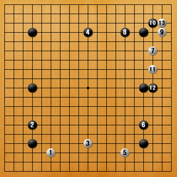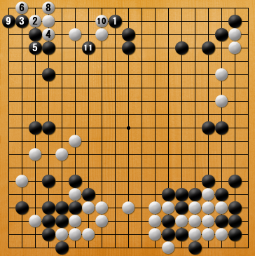 黒1から上辺白を攻めました。 白10となったところで、黒11と攻めました。 黒7は白2の上 |