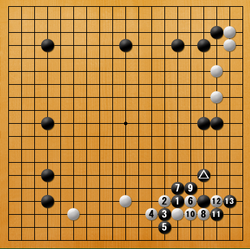 黒1、3とツケギリです。 白12のアテに対して黒ツギではなく、 △の石を活かして黒13とアテてみました。 |