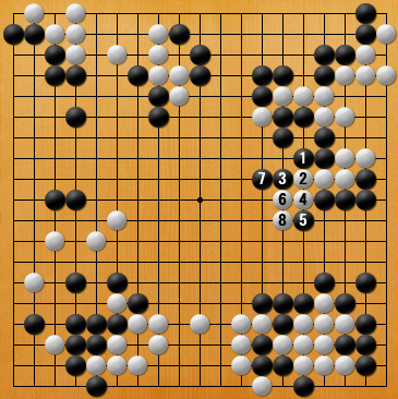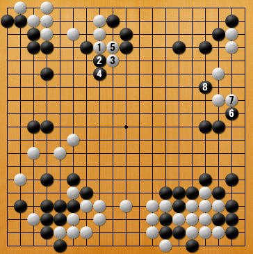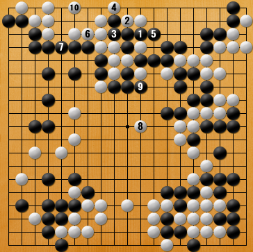 黒1、3、5、7をキカシます。 白8となった形は黒まあまあだと思います。 黒の断点が気になりますが、切られたら 黒4子は軽く見て打ちます。 |