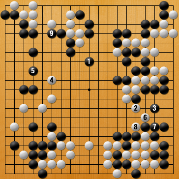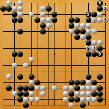 黒1と白1子をヌキました。 黒7まで、左上白の封鎖の準備が整ったので・・・ |