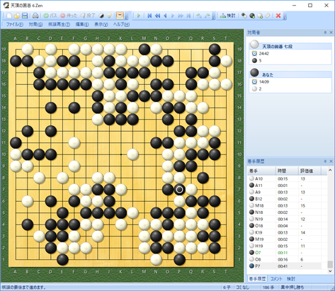 白4がまちがいだったと思います。 白4で黒5のところに打たれていたら、 コウになっていたと思います。 実戦は黒7でこの白は死にです。 白10には・・・ |