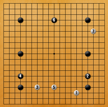黒1と一間バサミです。 白2には黒3とこちらから押さえます。 白6は疑問手ですが、大抵こう打ってきます。 |