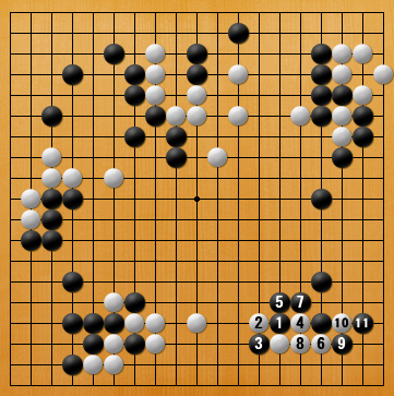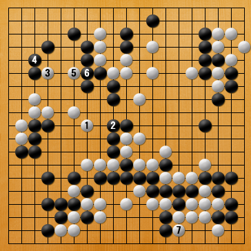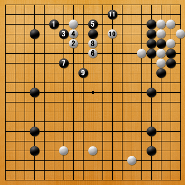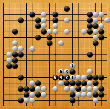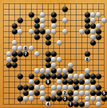 攻め合いは黒5まで黒勝ちです。 黒9となれば、こちらの白も死にです。 |