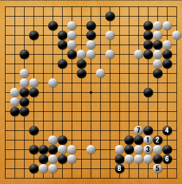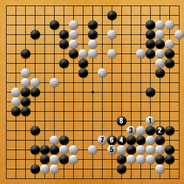 白7とカカエとなりました。 この時点で攻め合いは黒勝ちとなっています。 |
