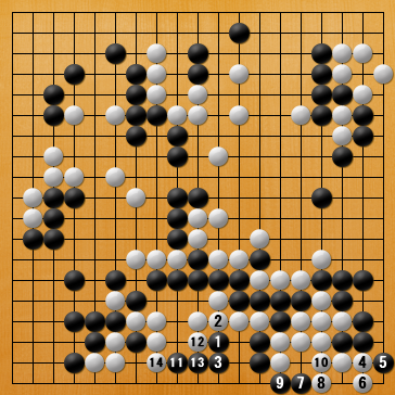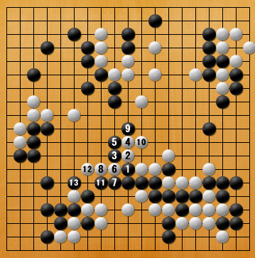 白1には黒2とここのキズをふさぎました。 白13に対してどう打ちますか? |