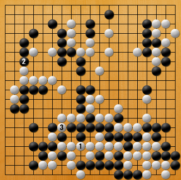 しかし攻め合いのところは置いといて、 黒1から左辺白を狙いにいきました。 |