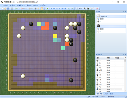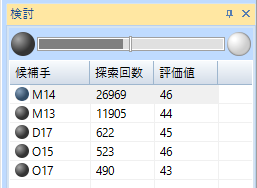 囲碁番組の対局を見ながら手を並べていくときや、 任意の棋譜を開いた後にこの「検討」を選ぶと 現在の形勢と次の候補手を最大5種類表示してくれます。 長い時間考えさせると検討がその分深くなり、 より正確な検討になるとのこと。 |