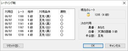 レーティング戦を行うことができます。 最初だけ自分の棋力を申請します。 10級~八段まで申請できます。 手合いはすべて互先で、勝つごとに対戦するコンピュータ の棋力も上がっていきます。 レートと言うものがあり、5級では1100になっていて、 1回勝つごとに20程度上昇します。 打ってみた感じレートは下記のようになっていると思いました。 5級 1100 4級 1200 3級 1300 2級 1400 1級 1500 初段 1600 二段 1700 三段 1800 四段 1900 五段 2000 |