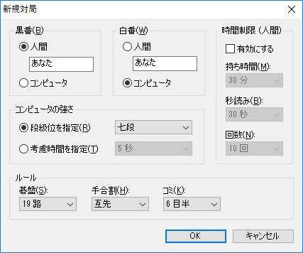 棋力は6級~七段まで選択できます。 置き碁は9子局まで選択できます。 盤面は9路、13路、19路の3種類から選択できます。 |