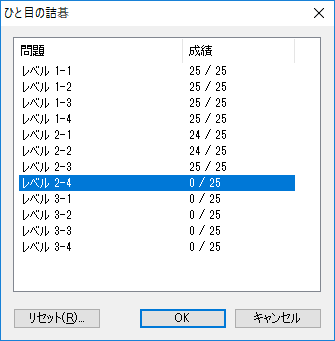 ひと目の詰碁はレベル 1-1~4、2-1~4、3-1~4の12段階で各25問の計300問 ひとまず1-1をやってみたところ、 これは非常に易しい問題でした。 |