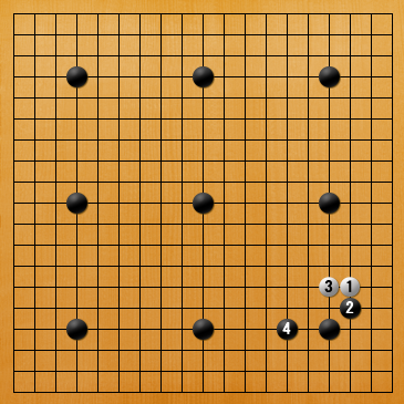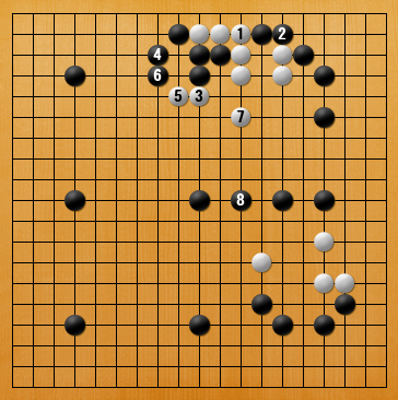 白3は黒4の右のキリを狙っているので、それを 防いで黒4です。 白7には黒8としっかり守りました。 |