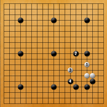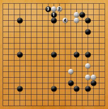 黒は1とツキアタリ、白2には黒3とオサエました。 白4とした形は黒から狙いがあります。 |