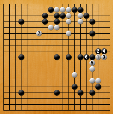 白は右下を補強してから、白7と打ちました。 黒は次にどう打ちますか? |