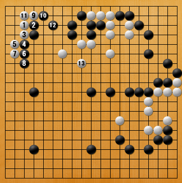 白は左上三々に入ってきました。 白13と手入れしました。 次に黒はどこに打ちますか? |