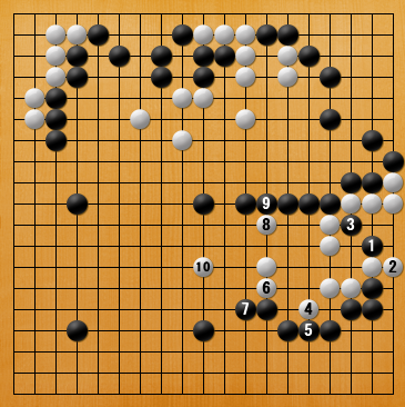 黒1とハサミツケです。 白2なら黒3とキリがあります。 白10となったところで、黒はどう打ちますか? |