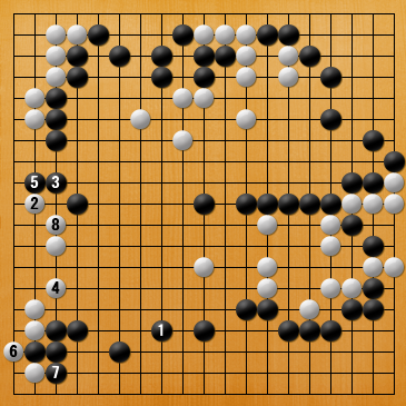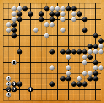 左辺はスソアキなので、黒1と下辺を大事に打ちました。 白8には・・・ |