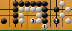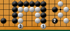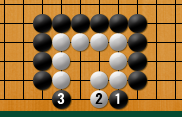 白1とハネ、黒2には白3と打てばイキとなります。 白3でイキなんて知らないとなかなか打てないと思います。 |