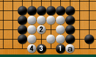 ではここに白aが加わった形は黒先でどうなりますか? これが今回のメインとなります。 この白は黒先でもイキとなります。 マゲのある方にハネがあるとイキという点を覚えてください。 |