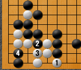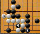 白は1と打ち、黒は2とツギます。 白3には黒4とホウリコミです。 |