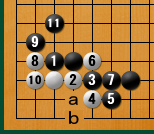 黒11までとなったとき、白は白4の石を aとツギますか?bとツギますか? どちらにツグのがいいのでしょうか? どちらにツナイでも白イキですが、 キキがちがってきます。 |