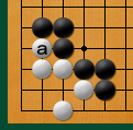 黒が小ゲイマにシマっているところに白が下ツケしてきたとき の図に白aが加わった形です。 さてこの形では黒先でどうなるでしょうか? |