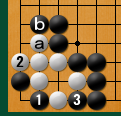 黒1、白2、黒3のとき、前回は白ツナぐことができましたが、 今回は白a黒bの交換があるため、白はツナぐことができず、 コウとなります。 |