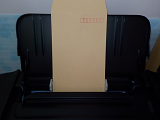 封筒は中央にガイドでセットします。また、印刷する面を表にして、縦方向にセットします。