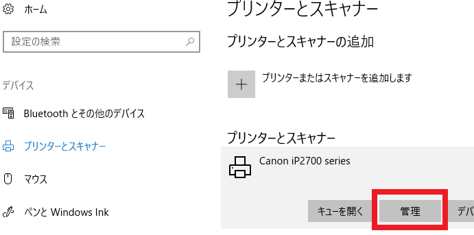 「プリンターとスキャナー」を選択して表示される画面の「Cannon iP2700 series」の