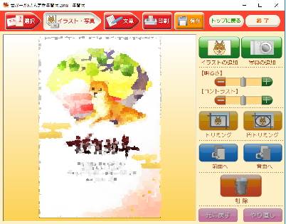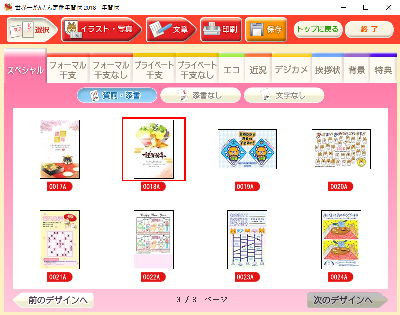 | 2 | デザイン選択画面 | 年賀状のデザインを選ぶ画面となります。 この画面で気に入ったデザインを選択します。 選択したら「イラスト・写真」ボタンをクリックします。 |