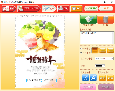 | 4 | 文章画面 | ここでは文章を挿入できます。「文章を追加」ボタンを押すと四角い枠ができて、 その中に好きな文章を書くことができます。移動もできます。 次に「印刷」ボタンをクリックします。 |