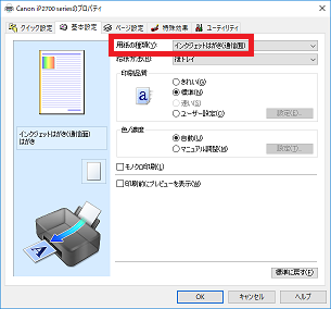 | 6 | プリンタ基本設定 | プリンタ設定画面となるので、「基本設定」の用紙の種類を「インクジェットはがき(通信面)」にします。 | ![]() |