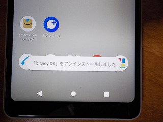 その状態で、少し上に動かします。 すると画面上に「削除」、「アンインストール」など表示されます。 そのまま「アンインストール」のところにアプリアイコンをドラッグします。 今回のアプリ「Disney DX」の場合は「削除」と「アンインストール」でしたが、 表示される内容はアプリによって違っており、すべてがアンインストールできるわけではないとのことです。 |